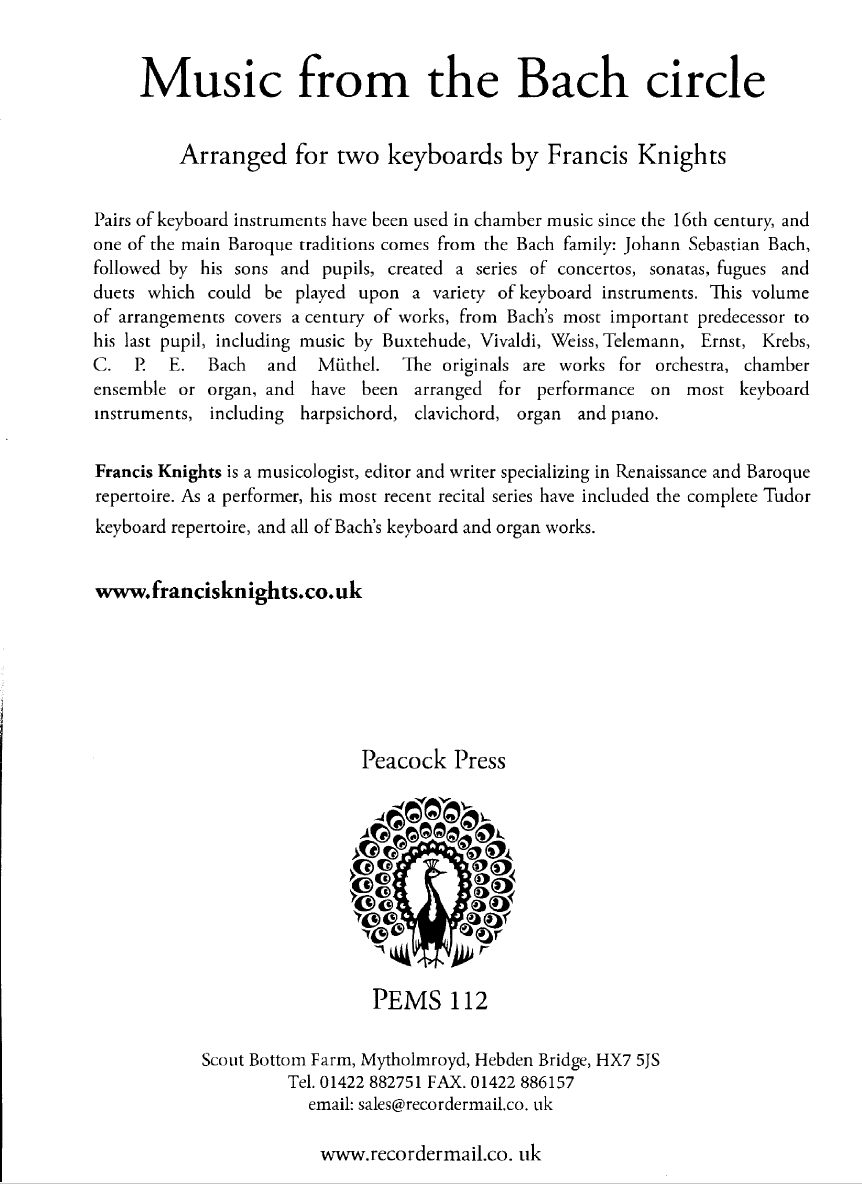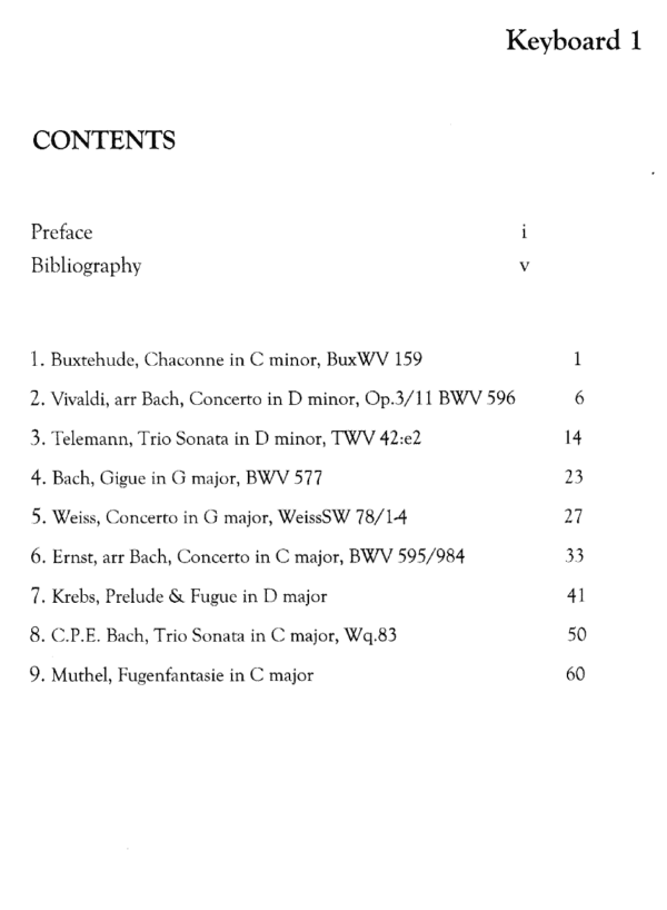 This volume of arrangements covers a century of works, from Bach's most important predecessor to his last pupil, including music by Buxtehude, Vivaldi, Weiss, Telemann, Ernst, Krebs, C. P. E. Bach and Müthel. The originals are works for orchestra, chamber ensemble or organ, and have been arranged for performance on most keyboard instruments, including harpsichord, clavichord, organ and piano.